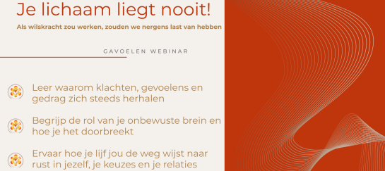 In ons 1-1,5 uur durende live webinar "Je lichaam liegt nooit; als wilskracht zou werken hadden we nergens last van" gaan we aan de slag met het praktisch toepassen van het conflict tussen denken en voelen. Hoe handel je daar nou naar? Vaak weet je het wel, maar doet je lijf niet mee. Welke rol speelt je onbewuste brein en hoe doorbreek je die oude gevoelens en gedragspatronen? Op weg naar raakbaar durven zijn en ook krachtig bij jezelf blijven!